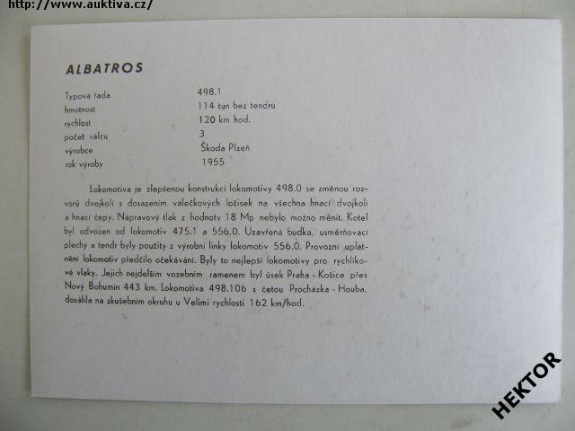Černobílý obrázek parní lokomotivy řady 498.1 ČSD - zvaný ALBATROS, velikosti 175 x 125 mm. Nový nepoužívaný, vydalo ČSD ředitelství Olomouc, nákladem 5000 výtisků pro vnitřní potřebu v roce 1989. Cena je za 1 kus.