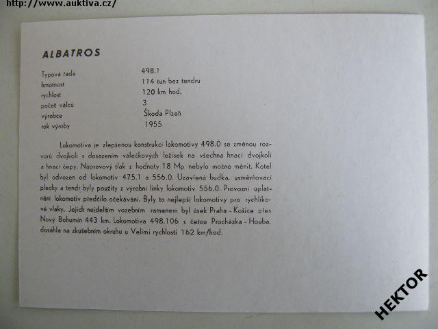 Černobílý obrázek parní lokomotivy řady 498.1 ČSD - zvaná ALBATROS, velikosti 175 x 125 mm. Nový nepoužívaný, vydalo ČSD ředitelství Olomouc, nákladem 5000 výtisků pro vnitřní potřebu v roce 1989. Cena je za 1 kus.