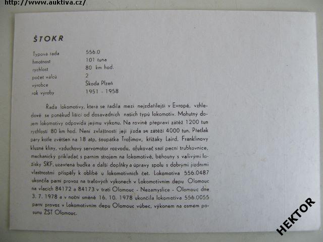 Černobílý obrázek parní lokomotivy řady 556.0 ČSD - zvaný ŠTOKR, velikosti 175 x 125 mm. Nový nepoužívaný. Vydalo ČSD ředitelství Olomouc, nákladem 5000 výtisků pro vnitřní potřebu v roce 1989. Cena je za 1 kus.