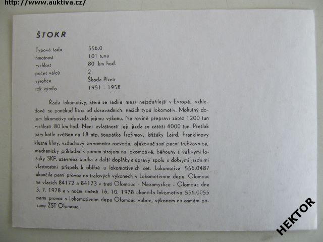 Černobílý obrázek parní lokomotivy řady 556.0 ČSD - zvaná ŠTOKR, velikosti 175 x 125 mm. Nový nepoužívaný, vydalo ČSD ředitelství Olomouc, nákladem 5000 výtisků pro vnitřní potřebu v roce 1989. Cena je za 1 kus.