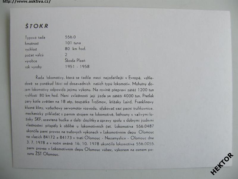 Černobílý obrázek parní lokomotivy řady 556.0 ČSD - zvaná ŠTOKR, velikosti 175 x 125 mm. Nový nepoužívaný, vydalo ČSD ředitelství Olomouc, nákladem 5000 výtisků pro vnitřní potřebu v roce 1989. Cena je za 1 kus.