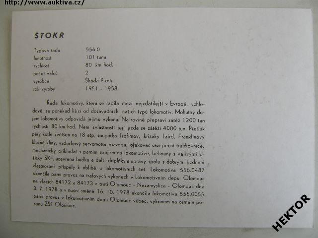 Černobílý obrázek parní lokomotivy řady 556.0 ČSD - zvaná ŠTOKR, velikosti 175 x 125 mm. Nový nepoužívaný, vydalo ČSD ředitelství Olomouc, nákladem 5000 výtisků pro vnitřní potřebu v roce 1989. Cena je za 1 kus.