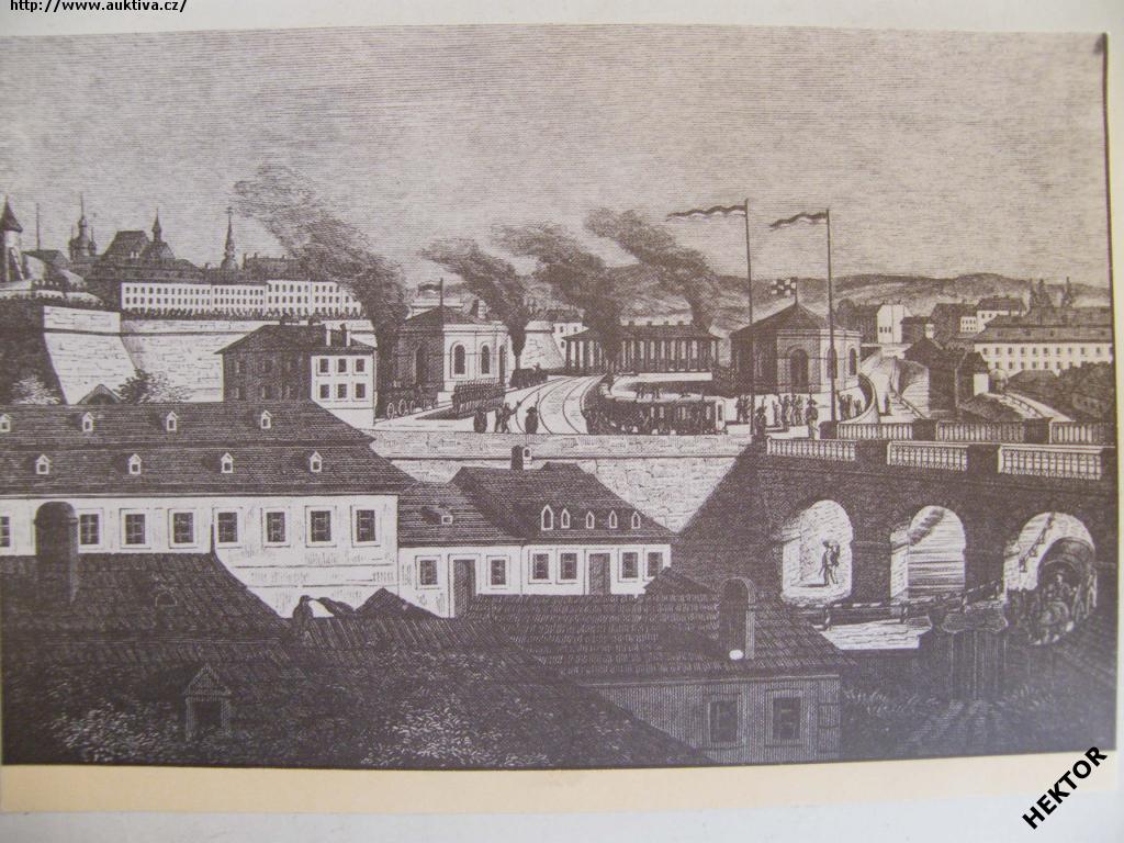 Kreslený černobílý obrázek - velikosti 241 x 155 mm – příjezd prvního vlaku do Brna – obr. 1. Nové nepoužité. Cena je za 1 kus.