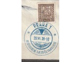 ČSR 1938 Příležitostné razítko modré Praha 1 III. Celostátní sjezd čs. filatelistů, zn. č.249 na výstřižku