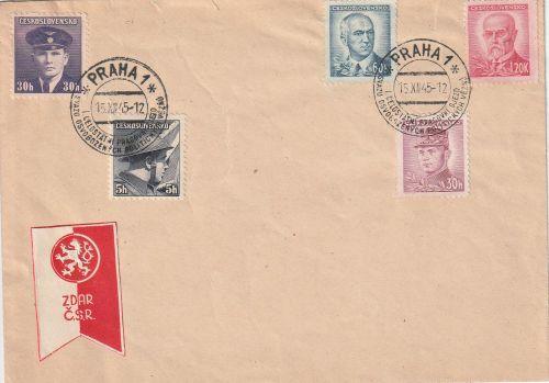ČSR 1945 obálka s příležitostným razítkem Praha 1 I. celostátní pracovní sjezd Svazu osvobozených politických vězňů, se zn. Pofis č.387, 391, 413, 418 a s nálepkou Zdar Č.S.R.