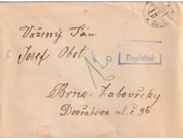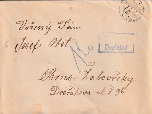 ČSR 1945 Solnice c, znárodněné protektorátní razítko (vysekaný německý text) na obálce se stanoveným doplatným (také odstraněný německý text) ručně 1,20.