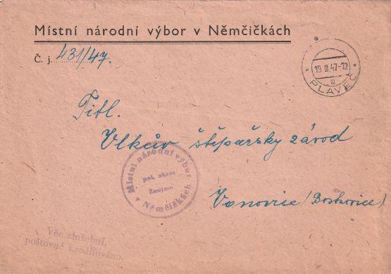 ČSR 1947 Služební dopis MNV v Němčičkách, protektorátní razítko Plavy s vysekaným německým názvem pošty