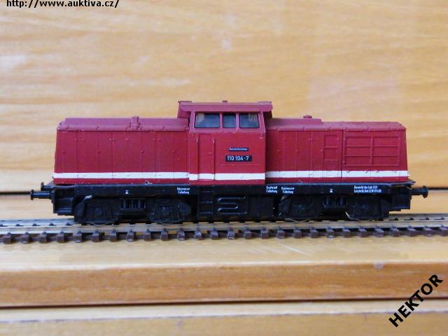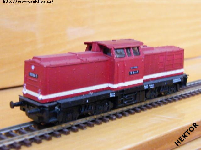 Sběratelský model dieselové lokomotivy BR 110 104-7, DR, tmavá červená, 1 krémový pruh, rám černý, podvozky černé, bez vnitřního osvětlení, výrobcem v 80. letech BTTB, kat. č. 02540. Výměnná spřáhla a umělohmotné nárazníky. Po zakoupení byl model odložen a pouze několikrát projet, je dlouho neježděn. Bez originální krabičky.