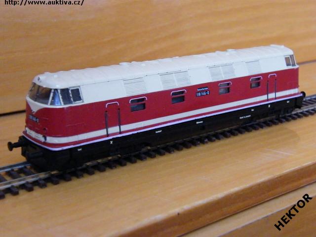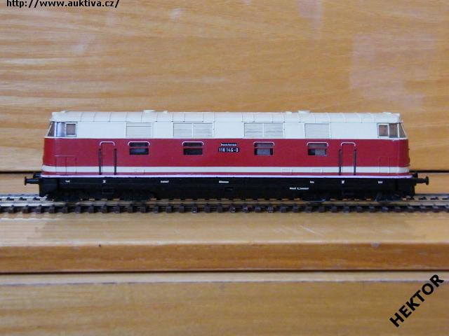 Sběratelský model dieselové lokomotivy BR 118 146-0, DR, karosérie stříkaná tmavší červenou s krémovými pruhy, střecha stříkaná krémovou, logo a popisy tištěny černou, rám černý, podvozky černé, výrobcem BTTB v 80. letech, kat. č. 2520. Výměnná spřáhla a umělohmotné nárazníky. Po zakoupení byl model odložen do vitríny a neježděn, je dlouho neježděn. Bez originální krabičky.