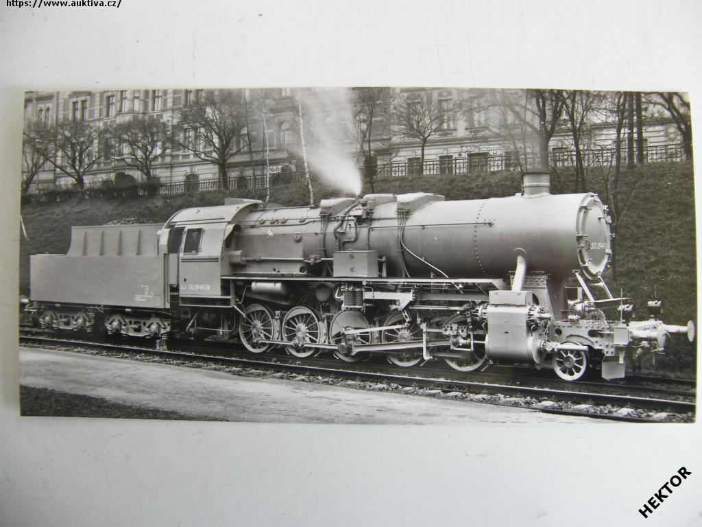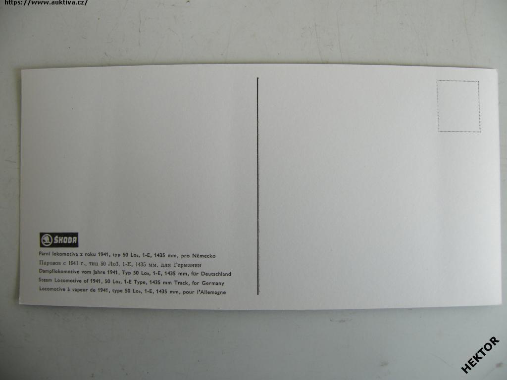 Černobílá podniková široká pohlednice vydaný k 50. výročí výroby lokomotiv v národním podniku Škoda Plzeň, stav k 31. 12. 1968 – parní lokomotiva z roku 1941, typ 50 Lo₃, 1 – E – rozchod 1435 mm, vyrobená pro Německo. Nová nepoužitá. Cena je za 1 kus.