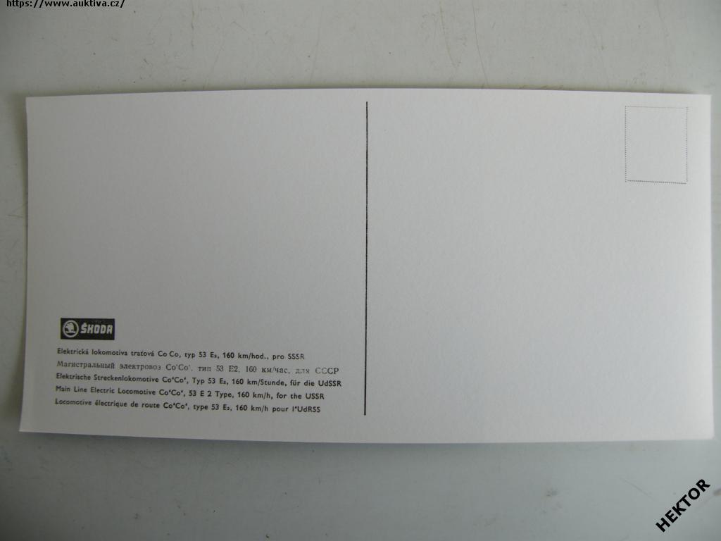 Černobílá podniková široká pohlednice vydaný k 50. výročí výroby lokomotiv v národním podniku Škoda Plzeň, stav k 31. 12. 1968 – elektrická traťová lokomotiva Co Co, typ 53 E₂, rychlost 160 km/hod., vyrobená pro SSSR. Nová nepoužitá. Cena je za 1 kus.