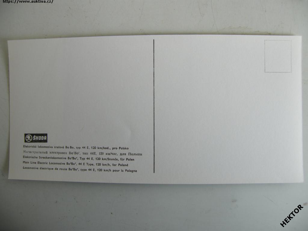 Černobílá podniková široká pohlednice vydaný k 50. výročí výroby lokomotiv v národním podniku Škoda Plzeň, stav k 31. 12. 1968 – elektrická traťová lokomotiva Bo Bo, typ 44 E, rychlost 120 km/hod., vyrobená pro Polsko. Nová nepoužitá. Cena je za 1 kus.