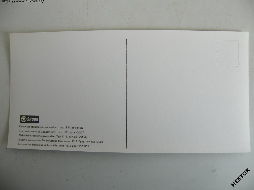 Černobílá podniková široká pohlednice vydaný k 50. výročí výroby lokomotiv v národním podniku Škoda Plzeň, stav k 31. 12. 1968 – elektrická průmyslová lokomotiva Bo Bo Bo, typ 13 E, vyrobená pro SSSR. Nová nepoužitá. Cena je za 1 kus.
