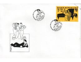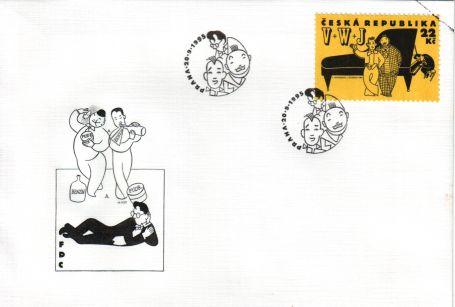 FDC 87 Osobnosti osvobozeného divadla Werich, Voskoves, Ježek 1995, provedení specimen - černá linka přes roh obálky, pošta předávala jiným poštovním správám, UPU a obchodníkům jako vzor