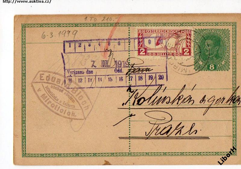 firemní dopisnice raz.Mirotice dat.7.3.1919,prošlá,O9/319