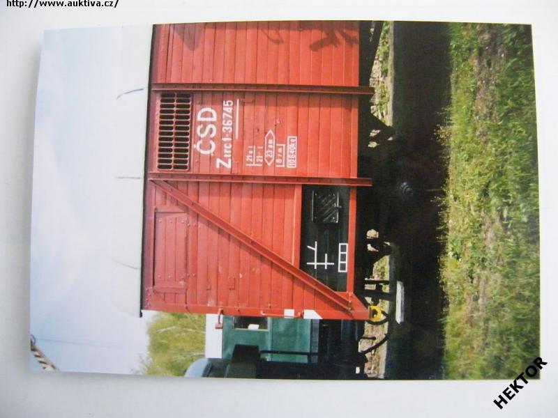 Fotografie barevná 2 osého zavřeného vozu s kulatou střechou po rekonstrukci - pohled na popis na karosérii vlevo - na odstavné koleji lokomotivního depa v Lužné u Rakovníka - kolem roku 2000. Rozměr 126 x 88 mm. Nová nepoužitá. Cena je za 1 kus.