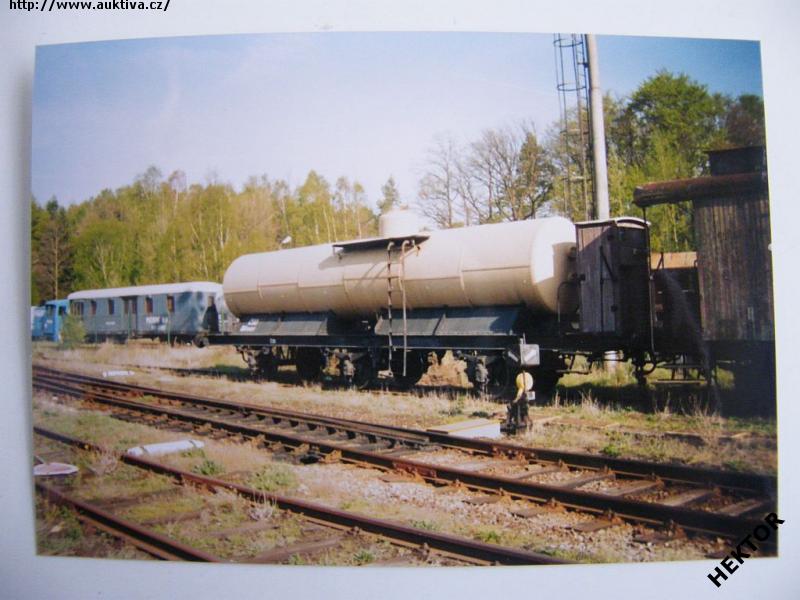 Fotografie barevná 3 osé cisterny s brzdařskou budkou na odstavné koleji na nádraží v Lužné u Rakovníka - kolem roku 2000. Rozměr 126 x 88 mm. Nová nepoužitá. Cena je za 1 kus.