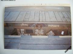 Fotografie barevná popisů na boku 4 osého plošinového vozu typu Sgls - foceno mezi hranou vozu a krytého nákladiště - na odstavné koleji bývalého nákladového nádraží v Plzni naproti pivovaru v červnu roku 2005. Fotografie velikosti 129 x 88 mm. Nová nepoužitá. Cena je za 1 kus.