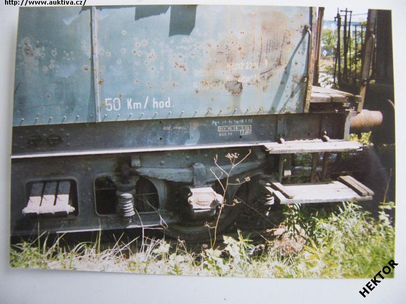 Fotografie barevná 4 osého zdevastovaného pracovního vozu určeného ke zrušení - pohled na pravé dvojkolí pravého podvozku - na odstavné koleji na nákladovém nádraží v Plzni - Koterově u Elektroúseku kolem roku 2000. Fotografie velikosti 126 x 88 mm. Nová nepoužitá. Cena je za 1 kus.