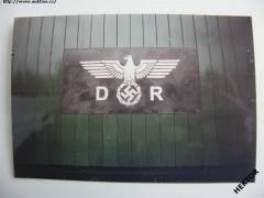 Fotografie barevná loga DRB na 2 osém služebním vozu typu Dd označeného správou dráhy DRB - na koleji na nádraží Lužná u Rakovníka v roce 2005. Fotografie velikosti 129 x 88 mm. Nová nepoužitá. Cena je za 1 kus.