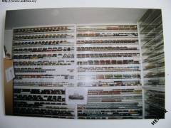 Fotografie barevná částí čtyř vitrín modelů lokomotiv a nákladních vozů velikosti TT. Fotografie velikosti 129 x 88 mm. Nová nepoužitá. Cena je za 1 kus.