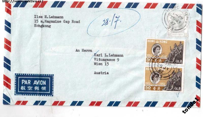 HONG KONG LETECKÝ DOPIS r. 1962 Michel č. 183, 2x195 - 072/O
