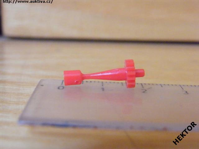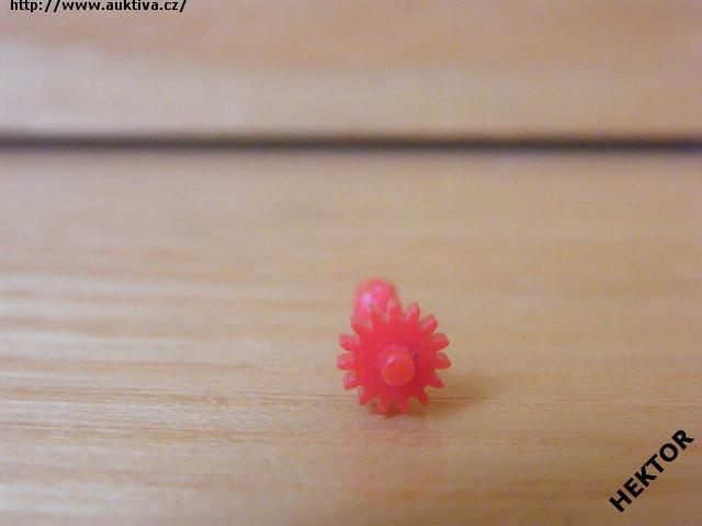 Hřídelka od motoru červená s ozubením délky 18,5 mm, 15 zubů, průměr ozubení 6,8 mm - TT. Nová nepoužitá. Cena je za 1 kus.
