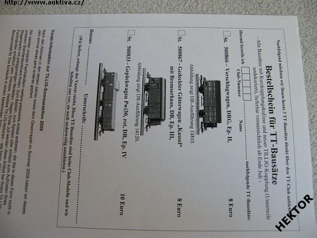 Velký černobílý katalogový list s objednávkou na stavebnice 3 vozů 2009 – firmy „TILLIG TT Bahn“ pro členy TILLIG TT Clubu ve velikosti TT z roku 2009. Nový nepoužívaný. Cena je za 1 kus.