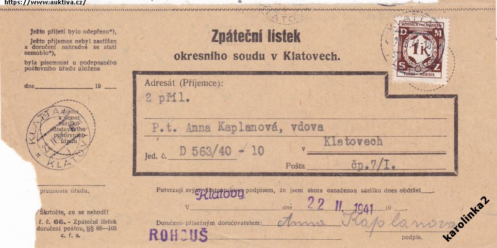 KLATOVY =ZPATEČNÍ LÍSTEK=rok1941=c13316