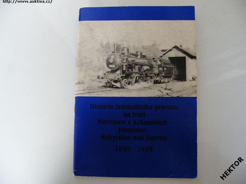 Sešitá brožura "Historie železničního provozu na trati Martinice v Krkonoších - Jilemnice – Rokytnice nad Jizerou - 1899 - 1989", vydala ZO SSM železniční stanice Jilemnice u příležitosti 90. výročí zahájení provozu, v roce 1989, nákladem 5000 výtisků. Trochu používaná. Cena je za 1 kus.