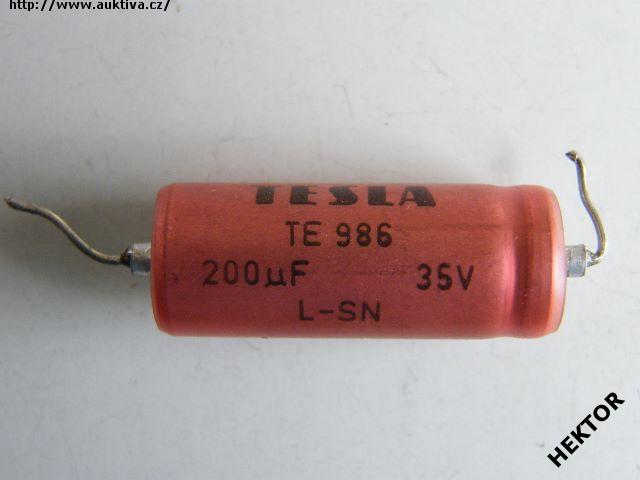 Kondenzátor typ TE 986, 200 μF, 35 V=, zkrácené a ohnuté vývody. Asi byl použitý. Cena je za 1 kus.