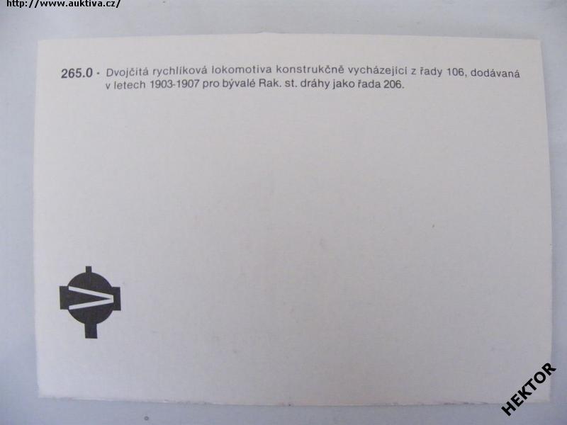 Kreslený barevný obrázek velikosti 148 x 105 mm - parní lokomotivy 265.0 ČSD od J. Rachoty s popisem na druhé straně obrázku. Nové nepoužité. Cena je za 1 kus.