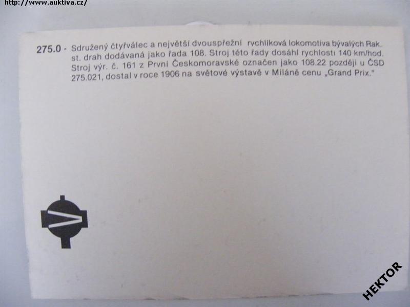 Kreslený barevný obrázek velikosti 148 x 105 mm - parní lokomotivy 275.0 ČSD od J. Rachoty s popisem na druhé straně obrázku. Nové nepoužité. Cena je za 1 kus.