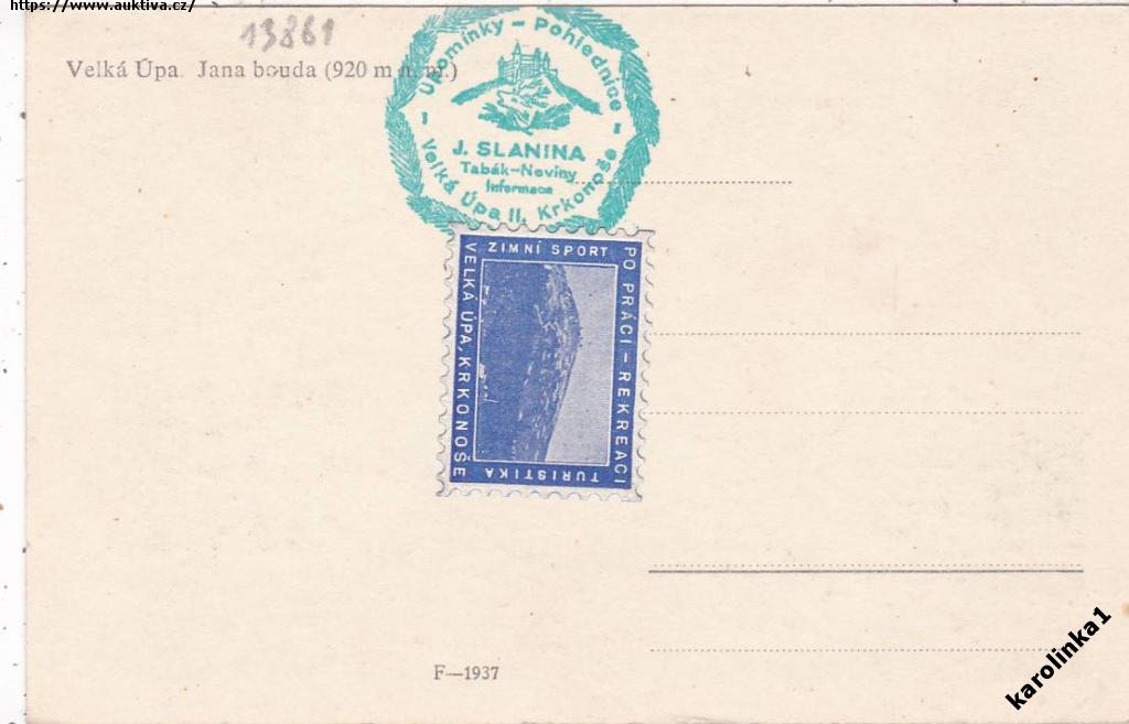 KRKONOŠE =VELKÁ ÚPA+VZADU NÁLEPKA REKLAMA =rok1930?*kc13861