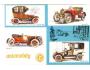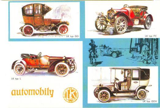 Laurin & Klement automobily č.2, barevná okénková pohlednice ccy 1975, podrobný popis typů na adresní straně