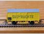 RARITA!!! Sběratelský model 2osého zavřeného chladícího vozu bez brzdařské budky typu G, DR, karosérie dřevěná stříkaná výraznou žlutou, stupačka pod dveřmi výrazná žlutá, kulatá střecha jako samostatný výlisek stříkaný šedou se 6 ventilacemi hladká, logo DR lisované výrazné žluté neobtažené, číslo vozu 18 - 01 - 57 lisované výrazné žluté neobtažené, popisy lisované výrazné žluté neobtažené, na boku tištěn nevýraznou zelenou velký vodorovný nápis "SÜDFRUCHTE" na výrazném žlutém podkladu, vlevo dole černý obdélníček, přechodky lisované obtažené černou, spodek vozu příhradový černý lepený, brzdová soustava vkládaná šedá. Výrobcem Zeuke v 60. letech, kat. č. 04/65. Průběžné spřáhlo Zeuke stříbrné a umělohmotná dvojkolí. Po zakoupení byl model odložen do vitríny a pouze několikrát projet, je dlouho neježděn. Bez originální krabičky.