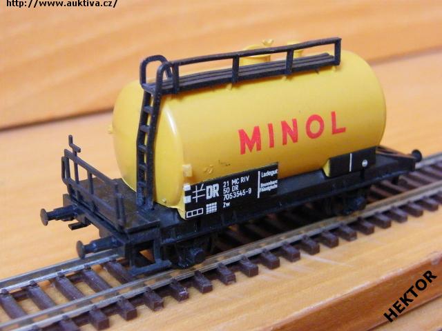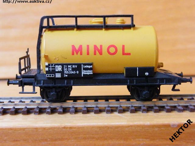Sběratelský model 2osé cisterny typu Zhh 52, DR, MINOL, kotel tmavý žlutý, logo a popisy tištěny bílou, na kotli tištěn červenou nápis MINOL, nízké kovové zábradlí brzdové lávky, umělohmotný žebřík a horní lávka, spodek vozu černý zaklapávací, brzdová soustava součástí spodku vozu. Výrobcem BTTB v 70. letech, kat. č. 4410. Výměnná spřáhla a umělohmotná dvojkolí. Po zakoupení byl model odložen do vitríny a pouze občas ježděn, je dlouho neježděn. Bez originální krabičky.