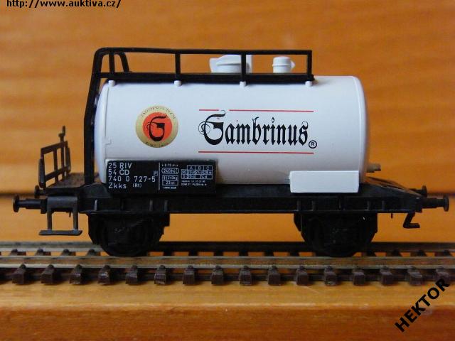 RARITA!!! LIMITOVANÁ SÉRIE!!! Sběratelský model 2osé cisterny typu Zkks, ČD, "Gambrinus", kotel stříkaný bílou, logo a popisy tištěny bílou, na kotli vlevo tištěno barevné logo pivovaru a vpravo tištěn černý nápis Gambrinus mezi 2 červenými linkami, nízké kovové zábradlí brzdové lávky, umělohmotný žebřík a horní lávka, spodek vozu černý zaklapávací, brzdová soustava součástí spodku vozu. Výrobcem Krokodil Praha v 90. letech. Výměnná spřáhla a umělohmotná dvojkolí. Po zakoupení byl model odložen do vitríny a neježděn, je dlouho neježděn. Bez originální krabičky.