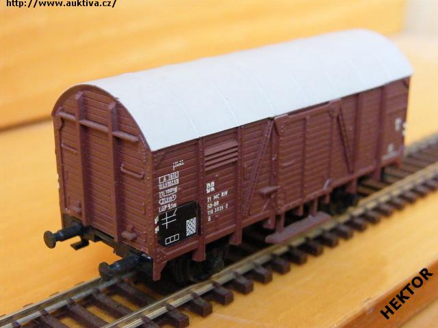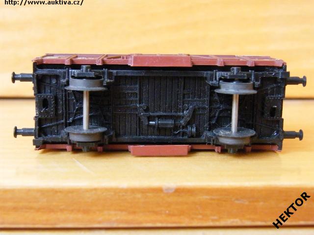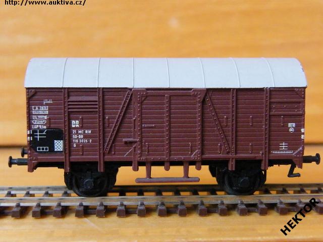 RARITA!!! Sběratelský model 2osého zavřeného vozu S NOVOU KAROSÉRIÍ bez brzdařské budky typu G, DR, karosérie dřevěná stříkaná tmavou hnědočervenou, !!!JIŽ NEJSOU madla posunovače!!!, stupačka pod dveřmi tmavá hnědočervená, kulatá střecha SOUČÁSTÍ KAROSÉRIE stříkaná světlou šedou NAPŘÍČ PERTLOVANÁ, logo DR TIŠTĚNÉ bílou, !!!číslo vozu 21 50 116 3 025 - 2 TIŠTĚNÉ bílou!!! ve IV. epoše, popisy TIŠTĚNÉ bílou, vlevo dole černý obdélníček, přechodky TIŠTĚNÉ bílou na černém podkladu, spodek vozu černý lepený, brzdová soustava součástí spodku vozu. Výrobcem Zeuke nebo BTTB počátkem 70. let, kat. č. 4110. Výměnná spřáhla a umělohmotná dvojkolí. Po zakoupení byl model občas ježděn, je dlouho neježděn. Bez originální krabičky.