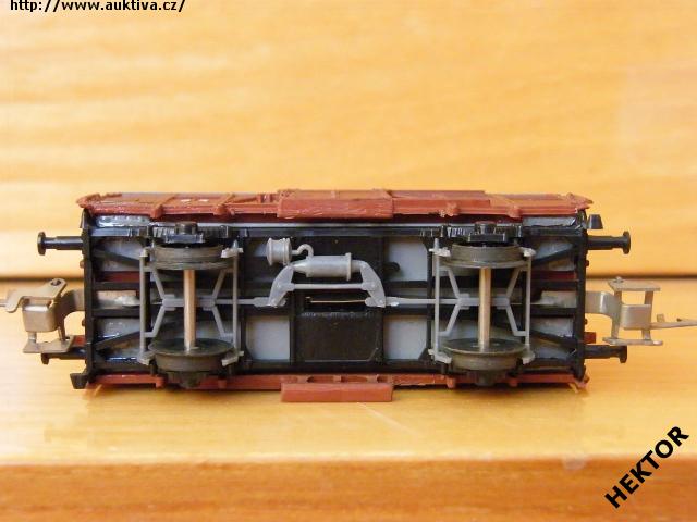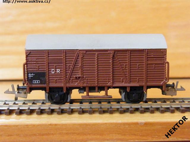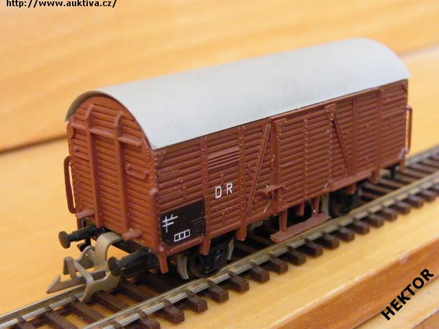 RARITA!!! Sběratelský model 2osého zavřeného vozu bez brzdařské budky typu G, DR, karosérie dřevěná stříkaná tmavší hnědočervenou, madla posunovače tmavší hnědočervená s otvory, stupačka pod dveřmi tmavší hnědočervená, kulatá střecha jako samostatný výlisek stříkaná světlejší šedou hladká, logo DR lisované obtažené bílou, číslo vozu 18 - 01 - 57 lisované tmavší hnědočervené neobtažené, popisy lisované tmavší hnědočervené neobtažené, vlevo dole černý obdélníček s bílými linkami, přechodky lisované černé, spodek vozu příhradový černý lepený, brzdová soustava vkládaná šedá. Výrobcem Zeuke v 60. letech, kat. č. 545/59. Průběžné spřáhlo Zeuke stříbrné a umělohmotná dvojkolí. Po zakoupení byl model občas ježděn, je dlouho neježděn. Bez originální krabičky.