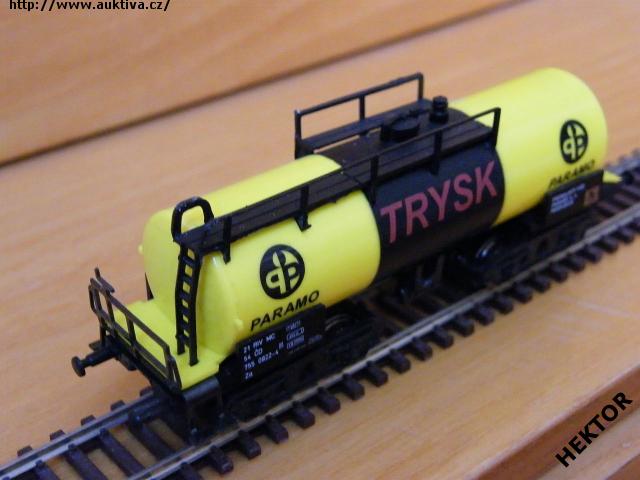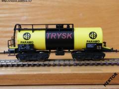 RARITA!!! LIMITOVANÁ SÉRIE!!! Sběratelský model 4osé cisterny typu Za, ČD, kotel barvený žlutou ve hmotě a uprostřed stříkaný široký černý pruh, logo a popisy tištěny bílou na černém podkladu, na kotli na obou krajích tištěno černou logo PARAMO a uprostřed tištěn červenou nápis TRYSK, nízké kovové zábradlí brzdové lávky, umělohmotný žebřík a obě horní lávky, 2osé černé podvozky typu III. Výrobcem Tillig roku 2003 pro Modellbahnshop Sebnitz, kat. č. 15409. Výměnná spřáhla a kovová dvojkolí černěná. Po zakoupení byl model odložen do vitríny a neježděn, je dlouho neježděn. V originální krabičce.