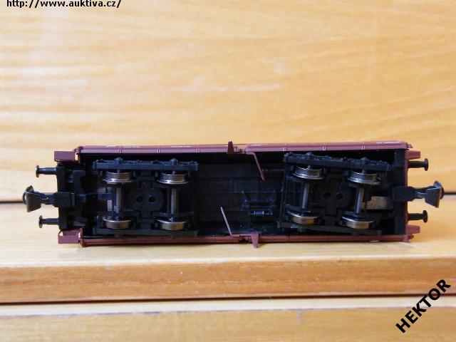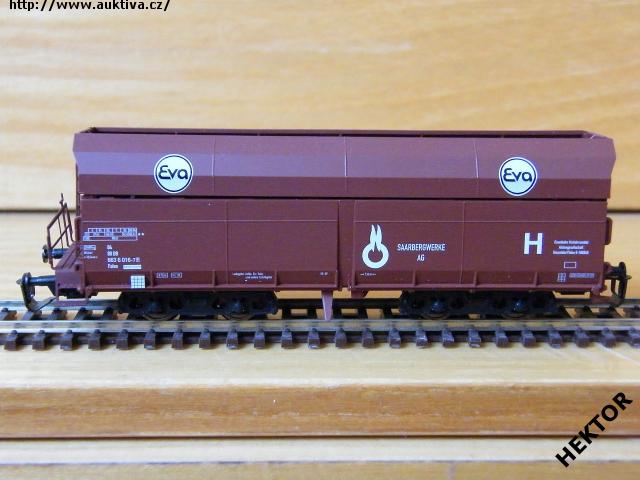 Sběratelský model 4osého výsypného vozu Falls s brzdovou lávkou, DB, Eva, prázdný, karosérie stříkaná hnědočervenou, logo a popisy tištěné bílou na hnědočerveném podkladu, vlevo dole bez černého obdélníčku, přechodky lisované bílé, 2osé podvozky černé, brzdová soustava součástí podvozků. Výrobcem Tillig od roku 2001, kat. č. 15213. Kinematika se šachtou pro krátké spřáhlo a kovová dvojkolí černěná. Po zakoupení byl model odložen do vitríny a neježděn, je dlouho neježděn. V originální krabičce.