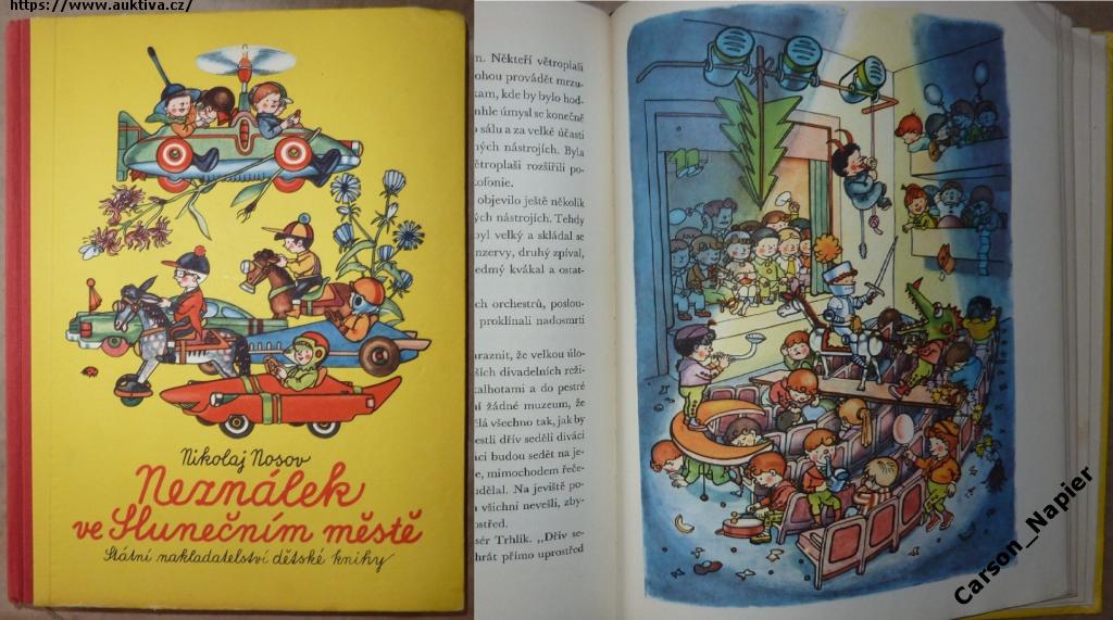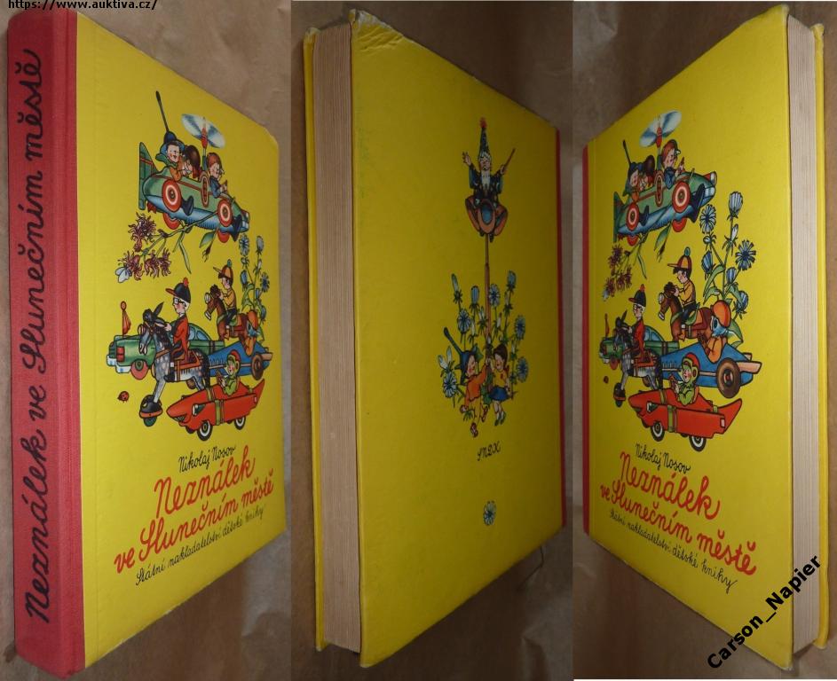 Nosov Neználek ve Slunečním městě, SNDK 1961, ilustrace Zápal, původní vazba s přebalem, kniha pěkný čistý stav, jen je mírně naražen zadní horní roh desek, přebal drobné ztráty a oděrky viz foto, naprostá vzácnost, s přebalem se nevyskytuje, poloplátěná vazba (pozdější vydání byla laminovaná vazba), u tohoto vydání byly ilustrace provedeny výraznými sytými barvami (pozdější vydání mají barvy vybledlé), při koupi více knih nebo časopisů poštovné dle ceníku České pošty
