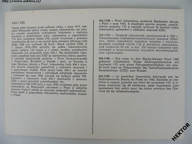 Obrázek barevný - parní lokomotiva 434.1100 ČSD s baňatým komínem a černým číslem. Nová nepoužitá. Cena je za 1 kus.