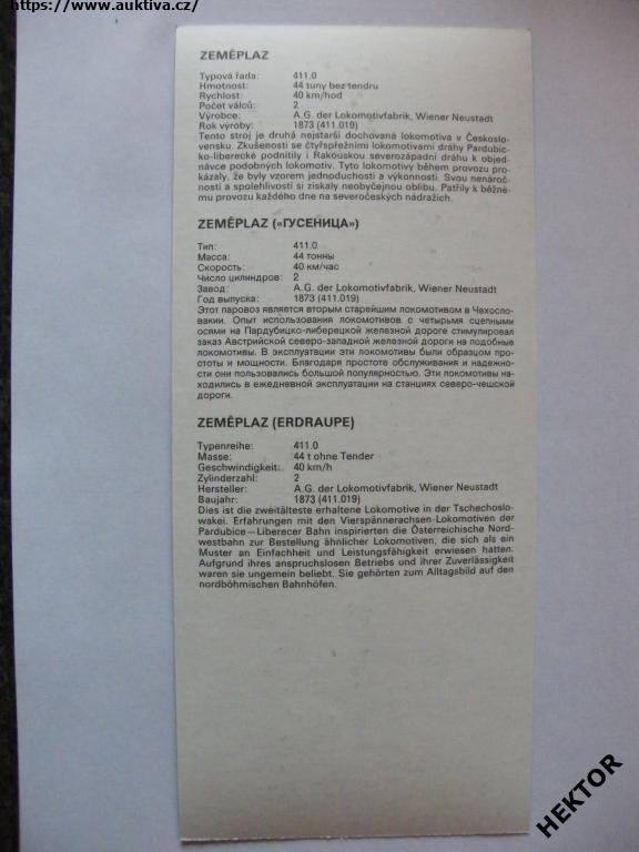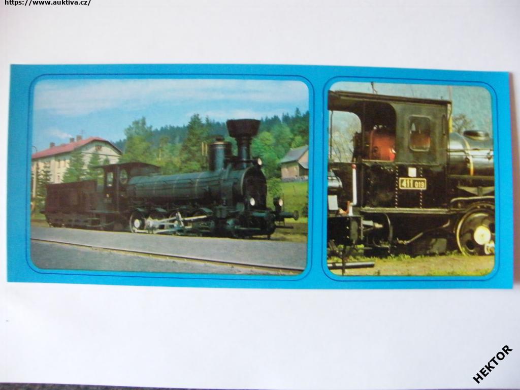 Český barevný obrázek velikosti 240 x 105 mm - parní lokomotivy řady 411.019 ČSD s přezdívkou ZEMĚPLAZ a další detail. Nová nepoužitá. Cena je za 1 kus.