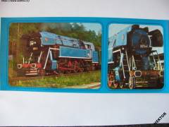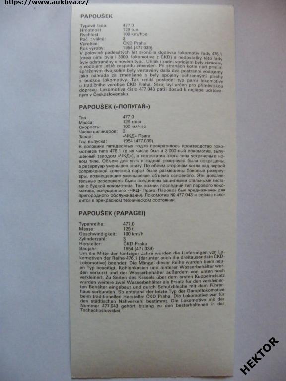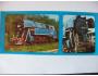 Český barevný obrázek velikosti 240 x 120 mm - parní lokomotivy řady 477.043 ČSD s přezdívkou PAPOUŠEK a další detail. Nová nepoužitá. Cena je za 1 kus.
