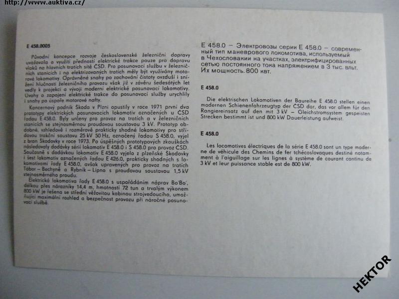 Český barevný obrázek elektrické lokomotivy E 458.0005 ČSD z dob hluboké totality. Nový nepoužitý. Cena je za 1 kus.