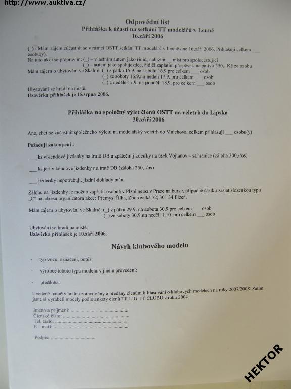 Černobílý jednostranný odpovědní list členů OSTT na účast členů Tillig TT Clubu v Leuně v roce 2006 + veletrhu v Lipsku + návrh clubového modelu pro české členy Tillig TT Clubu na roky 2007/2008. Nový nepoužitý. Cena je za 1 kus.