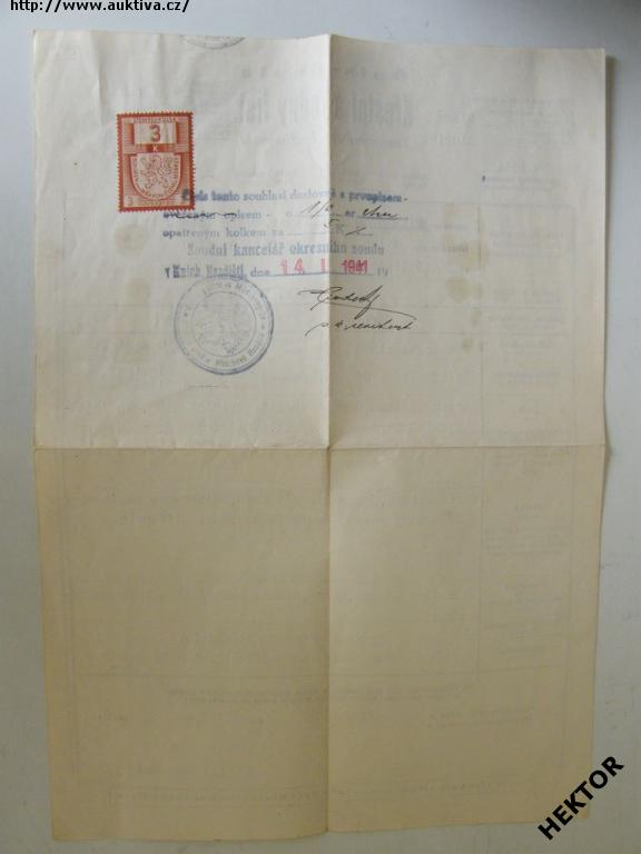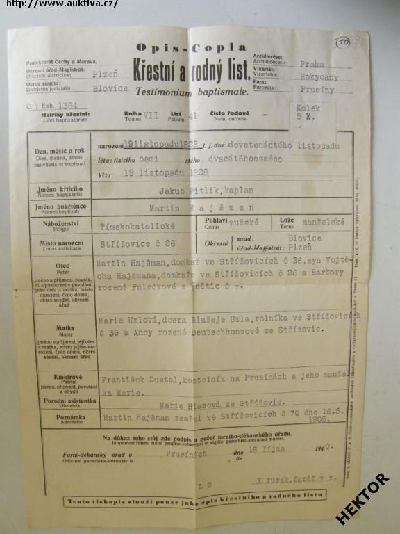 Opis křestního a rodného listu Martina Hajšmana vystavený Farním – děkanským úřadem v Prusínách dne 18. října 1940 ověřený Soudní kanceláří okresního soudu v Mnichově Hradišti dne 14. 1. 1941 za Protektorátu Čechy a Morava – psaný česky a latinsky. Použitý – opis, ale originál. Cena je za 1 kus.