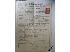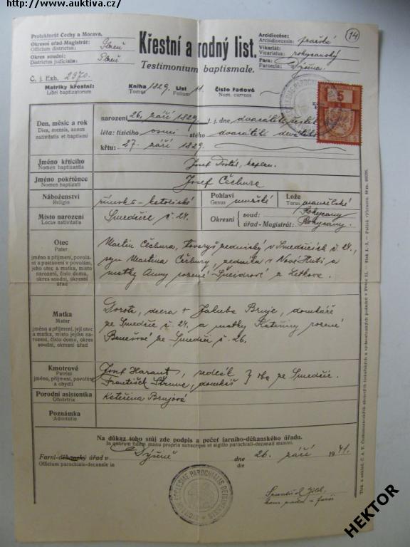 Opis křestního a rodného listu Josefa Čechury vystavený Farním úřadem v Dýšiné dne 26. září 1941 za Protektorátu Čechy a Morava – psaný česky a latinsky. Použitý – opis, ale originál. Cena je za 1 kus.